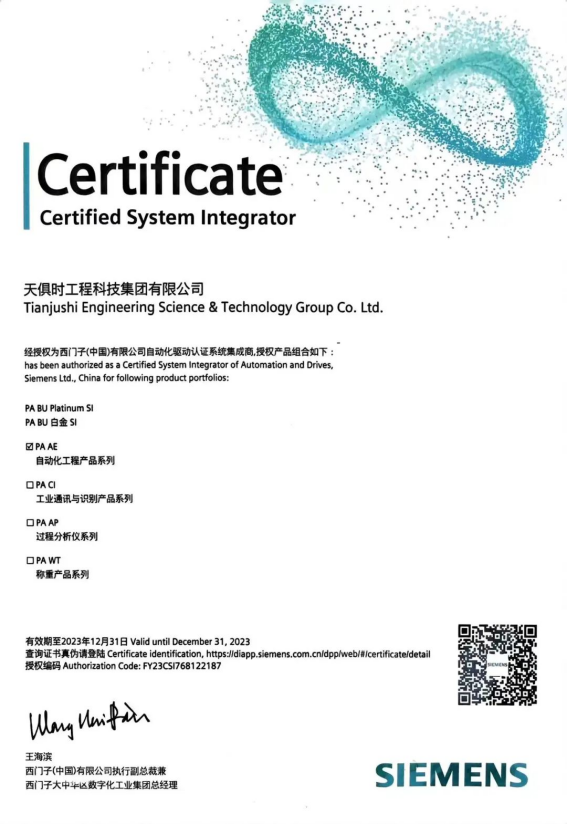 天俱時集團與西門子合作至今已有近二十年的歷程,是西門子過程自動化白金合作伙伴、西門子2022年度最佳技術賦能合作伙伴。
